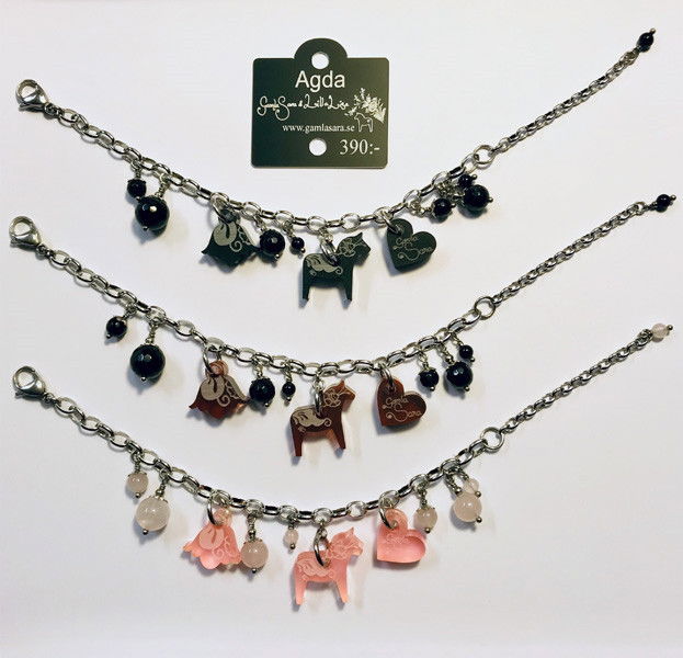 Armband mit Charms und Halbedelsteinen. Dalapferd mit Gravur, Schmetterling und unserem Herz-Logo. 8 Halbedelsteine unterschiedlicher Größe. Wählen Sie die Farbe Ihrer Reize Kette - wir haben unser Hammered Link 6x8mm verwendet Armbandlänge 20cm. Metallteile aus Edelstahl, blei- und nickelfrei gemäß EU-Anforderungen Design, "alte Sara"