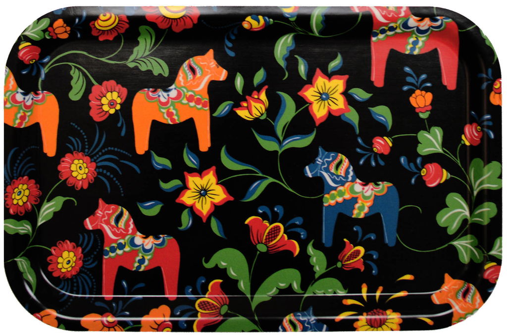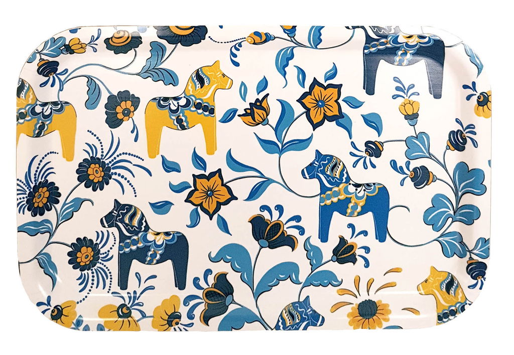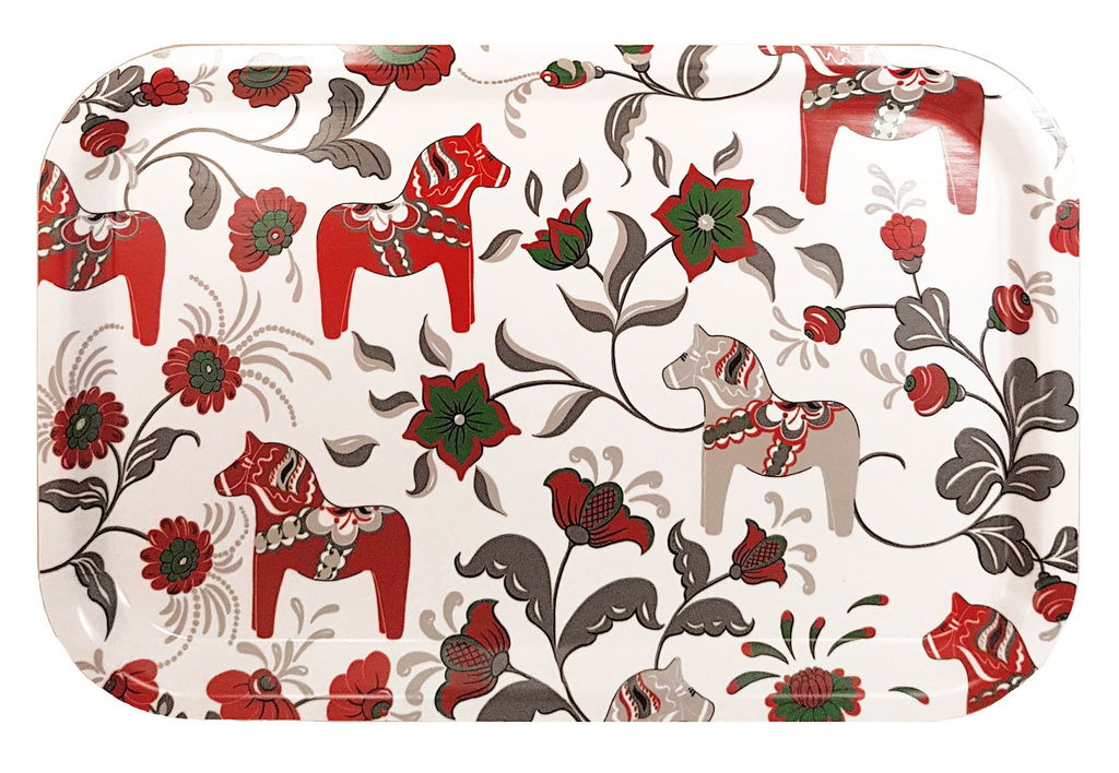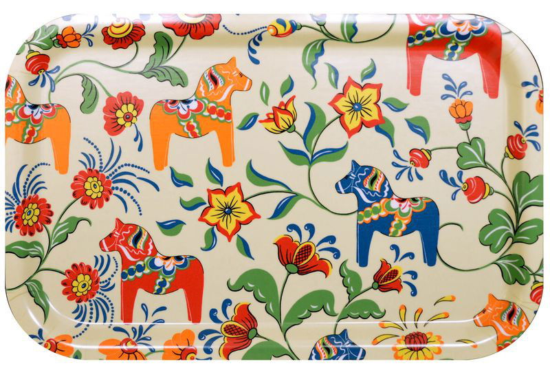 Bricka 32x21 cm i tålig trälaminat med ett mönster av kurbits och en dalahästar. Matcha gärna med muggar, kuddar och gardiner i samma serie! Färg: Blandade färger Material: Trälaminat Storlek: 32x21 cm Designer: Carola Bengtsson-Malmström
