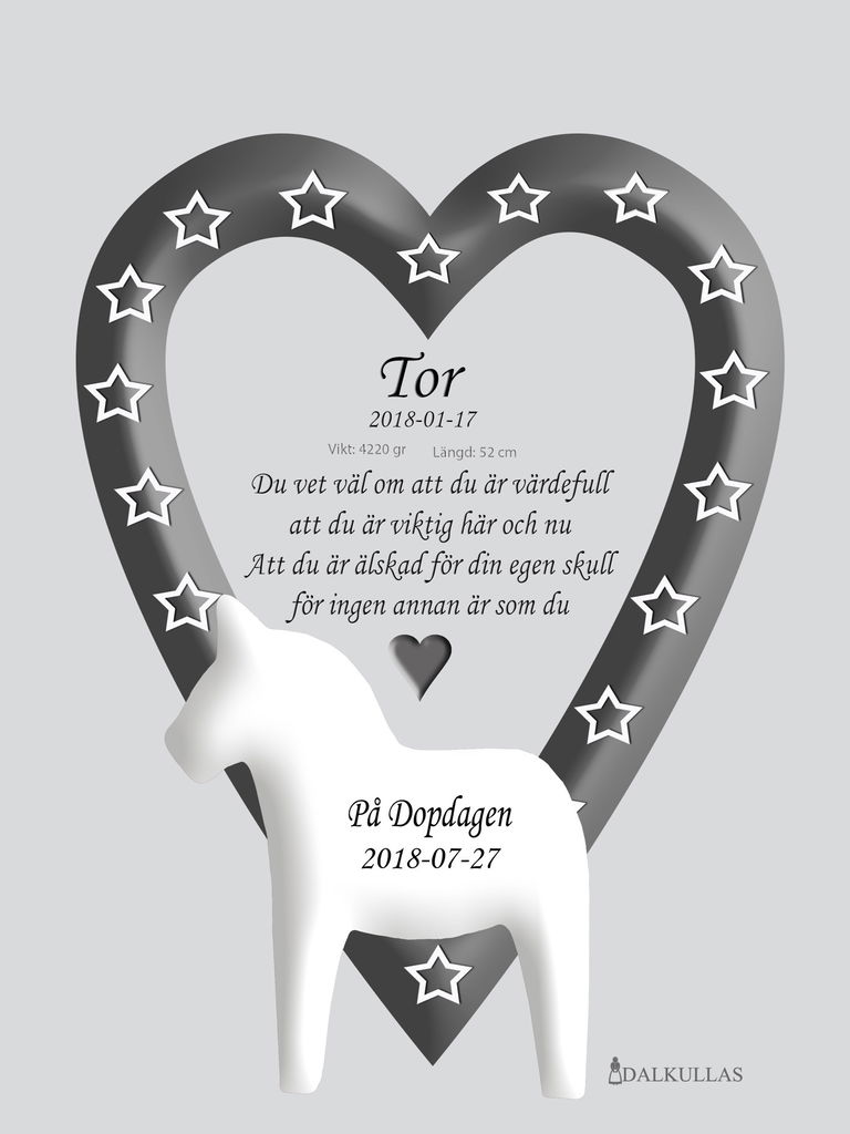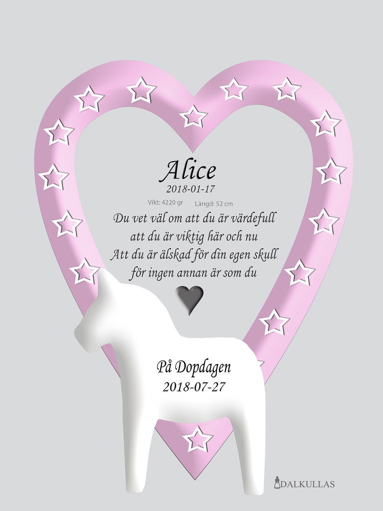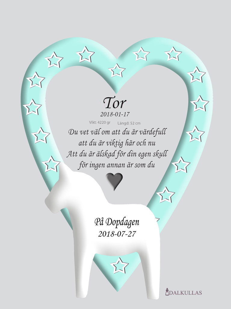 Taufbild/Namensbild mit weißem Dalapferd und Herz mit Sternen in Grau, Türkis oder Rosa vor hellgrauem Hintergrund.