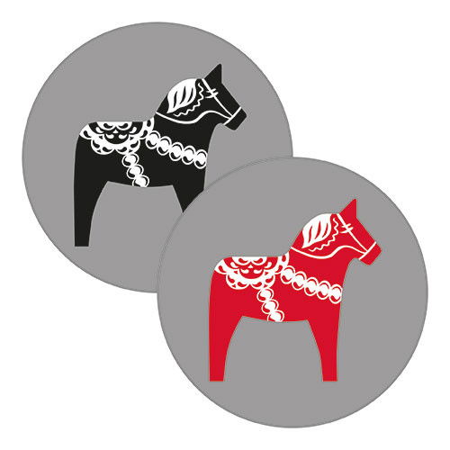Glasunderlägg i silikon med motiv av dalahäst. Vändbar röd på ena sidan och den andra svart. Tål maskindisk. Material: Silikon. Storlek/diameter: 9 cm