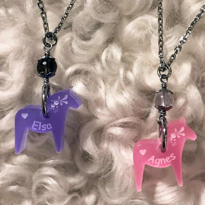 Halsband med en 2 cm hög dalahäst med namn. (OBS: På denna häst får vi plats att gravera in namn med max 7 bokstäver.) Dalahästen kompletteras med en halvädelsten som anpssas efter valet av färg på hästen. Kedja 38 cm av Ankarlänk 2x3 mm. Alla metalldelar i Stainless Steel, bly och nickelfria enligt EU:s krav.