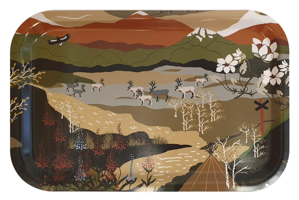 Bricka 33x21 cm i tålig trälaminat i serien Fjällvandring. Sälen, Idre eller Grövelsjön, vilket natur och fjällområde är din favorit? Alla har vi vår favoritplats här i serien Fjällvandring, ett härligt och vindlande naturmotiv med fjäll, renar och de klassiska röda ledkryssen. Design: Louise Videlyck. Matcha gärna med kuddar, gardiner, skärbräda i samma serie! Färg: Flerfärgad i modellerna blå, orange och brun. Material: Trälaminat Storlek: 33x21 cm Designer: Louise Videlyck