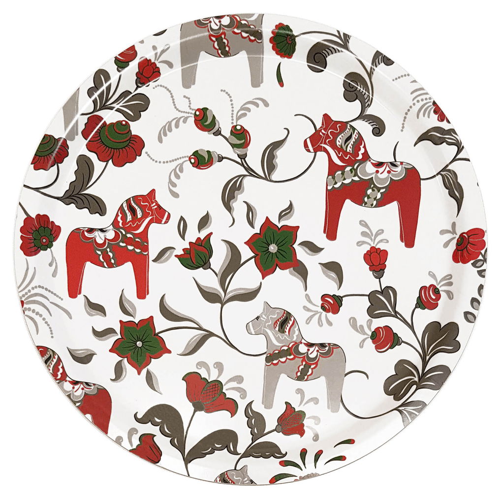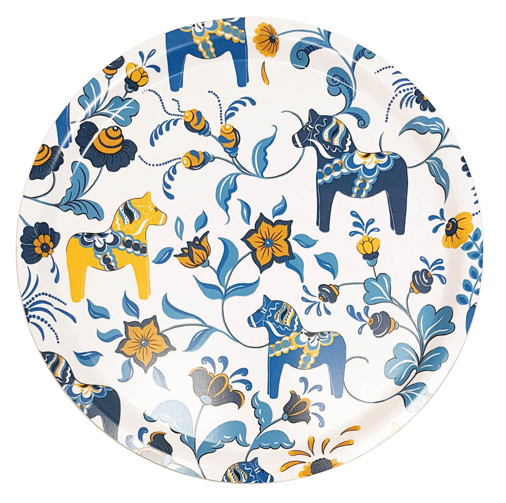 Rund bricka 31 cm i diameter i tålig trälaminat med kurbitsmönster och dalahästar. Matcha gärna med muggar, skärbräda, kuddar och gardiner i samma serie! Material: Trälaminat Storlek: 31 cm (diameter) Designer: Carola Bengtsson-Malmström