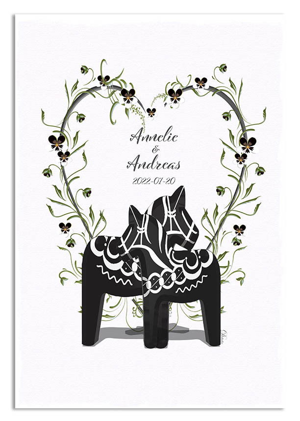 Bröllopstavla - Dalahästar med blomsterhjärta