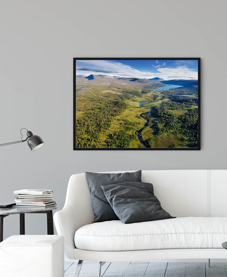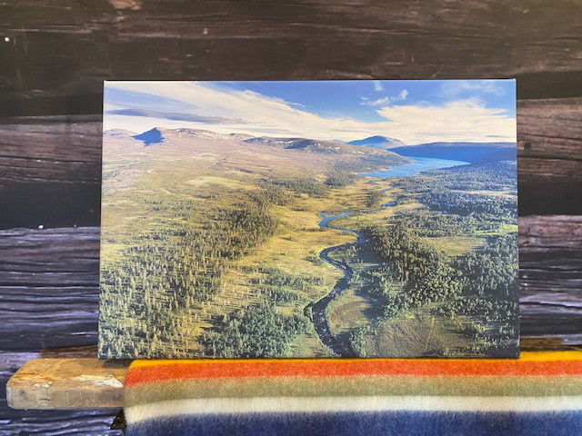 Canvastavla med motiv av sjön Grövelsjön i nordligaste Dalarna. Ån som rinner ut ur sjön i förgrunden heter Grövlan. Fjällen i bakgrunden ligger på den norska sidan dit man kan vandra, åka skidor eller ta sig med båt över Grövelsjön på somrarna. Canvastavla uppspänd och monterad på kilram, tryckt efter ett originalfoto av Per Eriksson, Falun. Finns i format 30x20 cm, 60x40 cm, 90x60 cm upp till det stora formatet 120x80 cm.