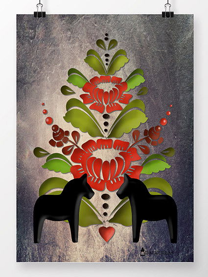 Kurbits i röda och gröna nyanser på stenvägg med två svarta dalahästar.
