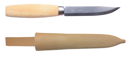 Så här såg en äkta Morakniv ut innan den fick sitt karakteristiska röda skaft. Med sitt björkskaft och exklusiva läderslida blir den ett både vackert och användbart tillskott i samlingen.