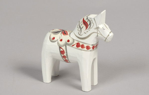 Dalahäst "Grålle" i en version med målning "krusning" i färgerna vitt och rött. Ett hantverk där varje häst täljs och målas för hand och där varje häst har sin egen prägel.