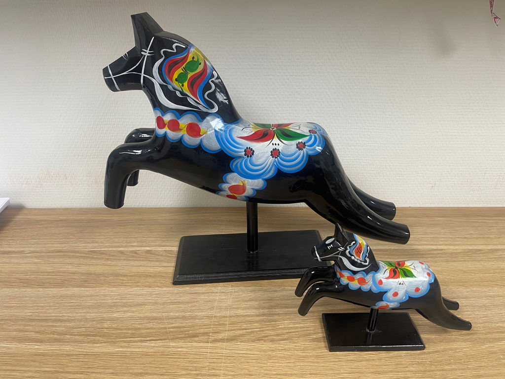 Dalahästen som hoppar, här monterad på en träplatta. Två exklusiv objekt, ett gediget hantverk från Mora, ett måste för samlaren. Den lilla mäter höjden 15 cm upp till örat, den stora hästen är hela 32 cm hög och sträcker ut sig närmare 39 cm på längden.