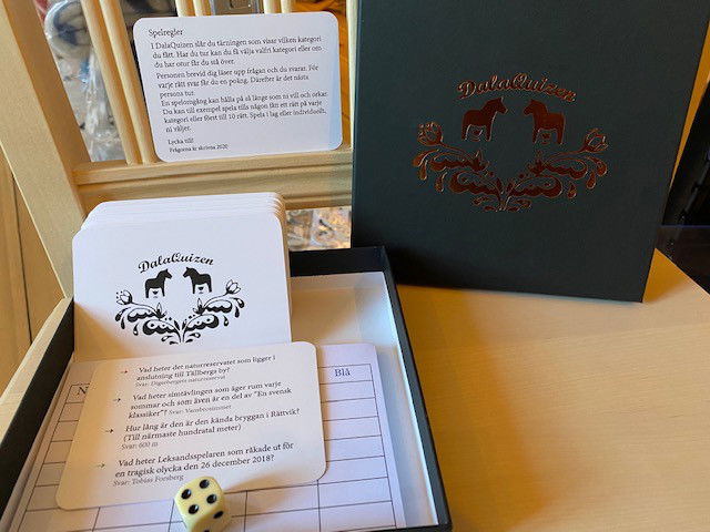 Dalaquizen! - Vem kan mest om Dalarna? 55 frågekort med totalt 220 frågor i olika kategorier, allt om Dalarna! Evenemang, Kultur, Kändisar, Sport, Sevärdheter och kategorin "Slumpen" som bjuder på blandade frågor. Ett perfekt spel att ta fram och utmana din familj och vänner. Ett måste i sommarstugan eller i husvagnen, eller på konferensen och företagseventet. Vem kan mest och blir mästaren på Dalarna? Innehåll: 55 frågekort, 1 kort med spelregler, Poängblock och tärning. Mått på boxen: 16,5x16,5 cm, höjd 3 cm. Har du en butik och vill bli återförsäljare av Dalaquizen? Hör av dig till oss för mer information. info@dalarnadesign.se Ett extra pack med ytterligare 220 frågor på 55 frågekort lanseras under hösten och kan köpas till som ett komplement till spelet för att få ytterligare frågor. Detta är ett spel som Dalarna Design tagit fram och vidareutvecklat efter att vi i somras förvärvade UF-företaget Dalaquizen.