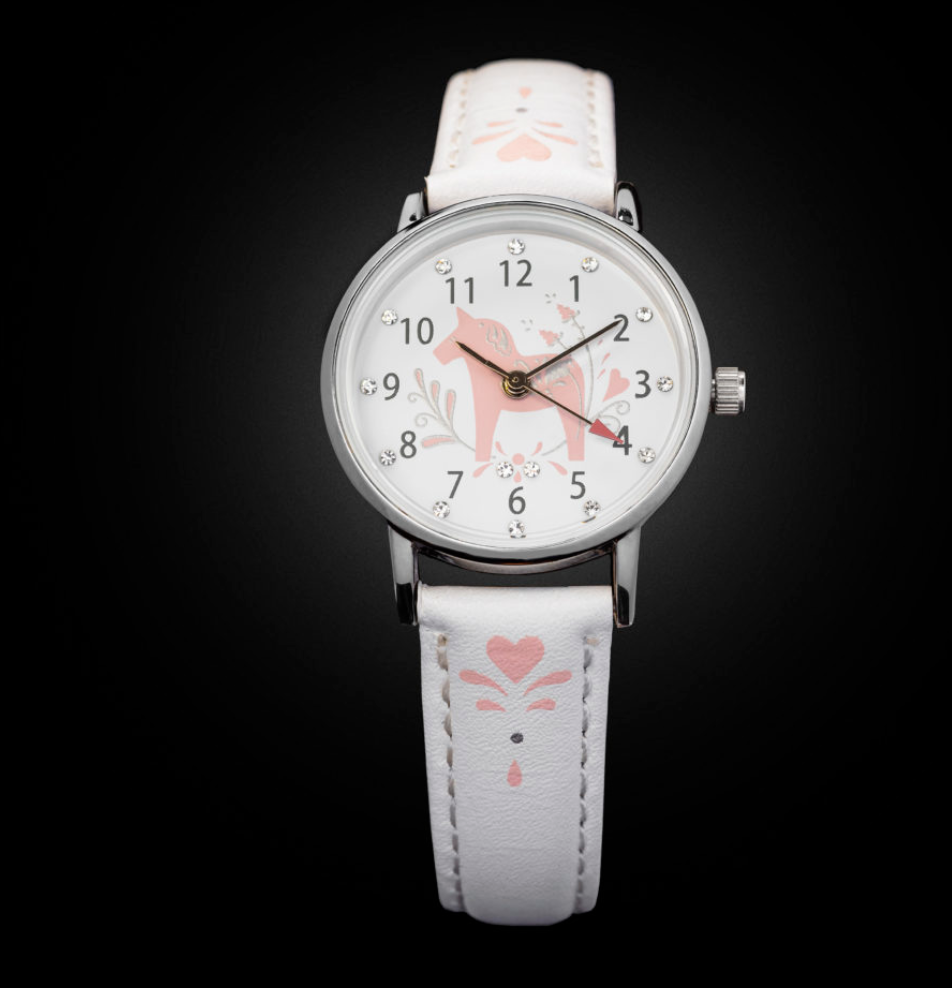I samarbete med Lena Persson på LP Design i Borlänge har designen av denna fina klocka tagits fram. Boetten på klockan har en storlek om endast 28 mm och passar därmed lika bra på armen för vuxen som barn. Stenarna i tavlan är Swarovski och bandet är tillverkat i genuint läder. Beskrivning Storlek: 28 mm Urverk: Miyota Garantier: 2 år