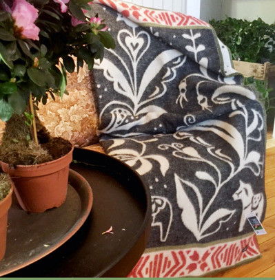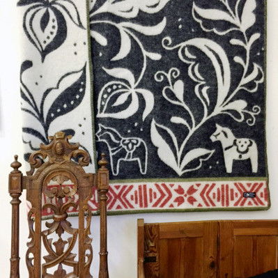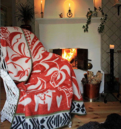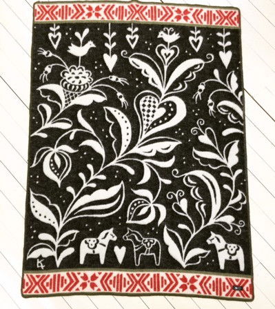 Filten Dalarna är inspirerad av både dalahästar, kurbits och de dräktband som finns på Dalarnas vackra folkdräkter. Formgivare Kerstin Landström 100 % NZ ekologisk ull. Storlek 130 x 185 cm. Färger Svart med vitt mönster, bård i rött och grönt Vit med blått mönster, bård i mörkblått och turkos Röd med vitt mönster, bård i svart och grönt Skötselråd Ull är smutsavvisande och nästan självrengörande men mår bra av att vädras ofta. Filtarna kan tvättas för hand eller på handtvättprogram 30 grader i maskin. Använd ulltvättmedel eller ett milt schampo. Kort centrifug eller krama filten halvtorr mellan handdukar och torka den sedan luftigt. En enstaka fläck kan oftast lätt tvättas bort med bara vatten direkt under kranen. Tvätta inte ullprdukter i onödan!