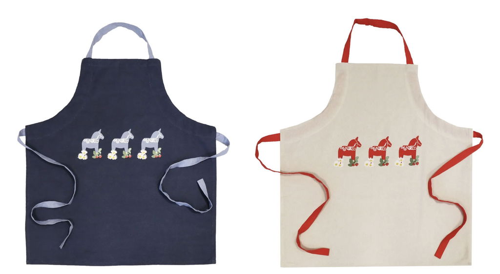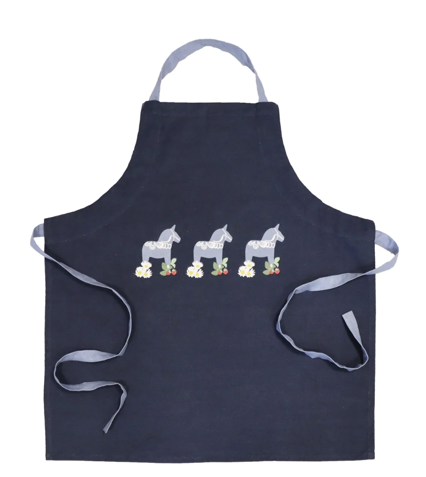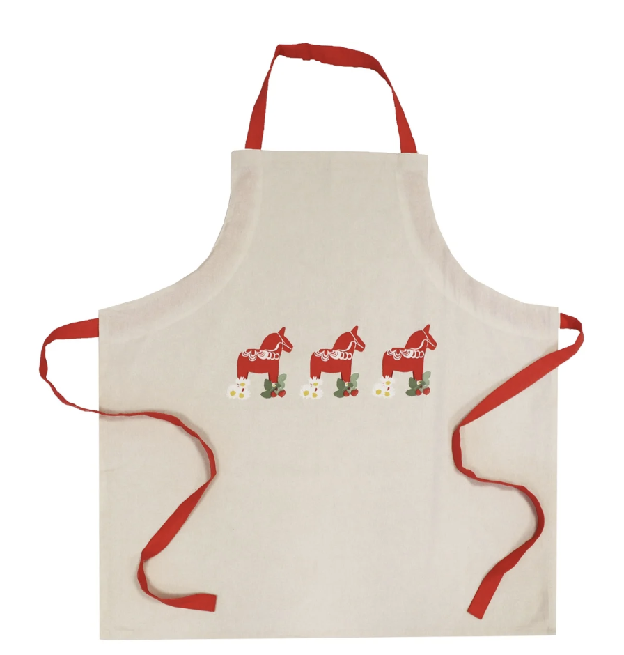 Förkläde modell Orsa med mönster och motiv av Dalahästar. Samma mönster som fleeceplädarna, bäddset och handdukarna i samma serie! Material: 100% bomull Storlek: 75x80 cm Tvättråd: 40 grader