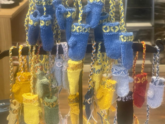 Ett härligt litet hantverk! Stickade små miniatyrvantar med flätat band. Att använda som bokmärke eller bara som prydnad. Storlek vante, 6 cm, bandet 25 cm. Begränsat antal och färger! Ett hantverk från Irene Svensson och "Kattens trasmattor" i Falun!