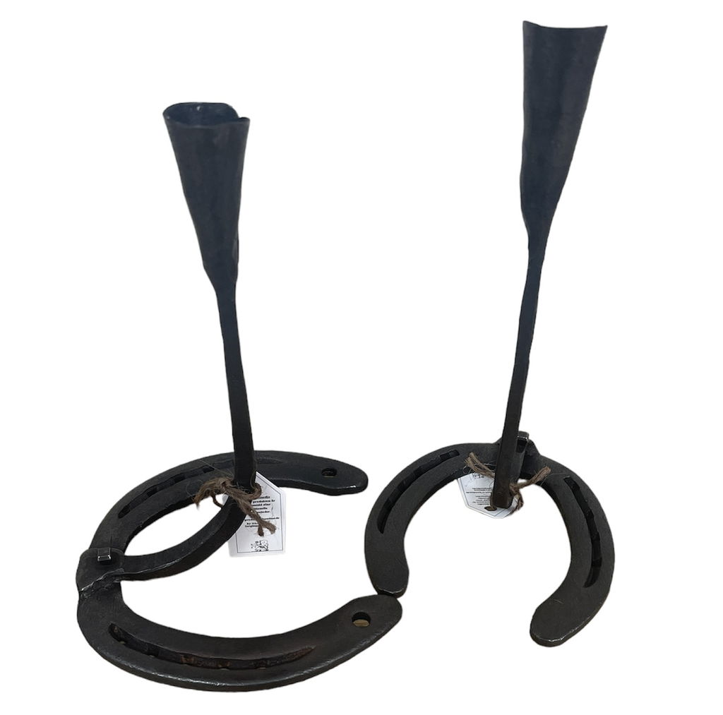 Ett helt unikt och gediget hantverk. Ljushållare i linoljebräntsmide på en fot av en hästsko. Höjden kan variera 20-25 cm då det är ett hantverk. Tillverkare: Carina Nolåkers, Carinas Smedja i Borlänge.