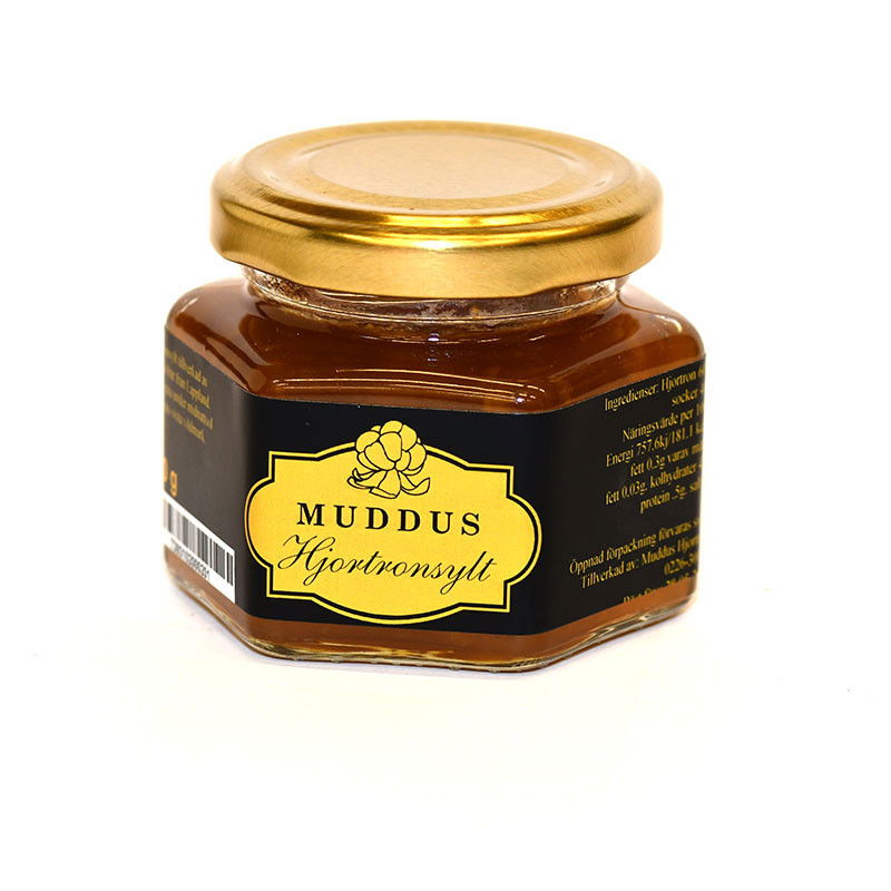Burk 110 gram med en härligt välsmakande hjortronsylt från företaget Muddus i Kolarbo utanför Avesta. Ingredienser: Hjortron 60 %, socker 40 %, varav tillsatt 40 %. Öppnad förpackning förvaras svalt. Näringsvärde per 100 g: Energi 757,6kj/181,1kcal,fett 0,3g varav mättat 0,03g, kolhydrater 42g, protein 0,5g, salt 0g.