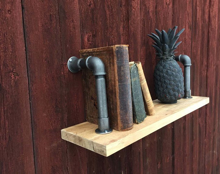 Komplett hylla med två konsoler av rör och ett hyllplan av massiv ek. Industriell stil med rejäla rör som klarar tunga laster. Går att montera på flera sätt, sätt den som på bilden för ett smart bokstöd!