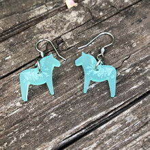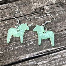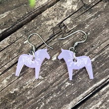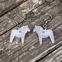 Örhängen med 17mm hög kurbitsgraverad Dalahäst i 3 mm frostad plexi. Små nätta Dalahästar passar Liten som Stor Örkrokarna i Stainless Steel 316L
