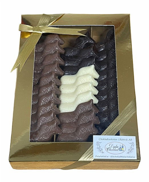 Presentask med 30 smäktande goda dalahästar i choklad. 13 ljus choklad, 13 mörk choklad och 4 i vit choklad. Fina och goda att äta, och väldigt trevligt att ge bort! Innehåll: Mörk choklad 62%: Kakaomassa, socker, kakaosmör, naturlig vanilj, emulgering: sojalectin. Kan finnas spår av mjölkprotein. Ljus choklad 34%: Socker, kakaosmör, mjölkpulver, kakaomassa, kakaosmörk, naturlig vanlig, emulgering: sojalectin. Vit choklad: Socker, kakaosmörk, naturlig vanilj, mjölkpulver, emulgering: sojalectin. Chokladen kan innehålla spår av nötter och mandel. Förvaras torrt och svalt 12-20 grader.