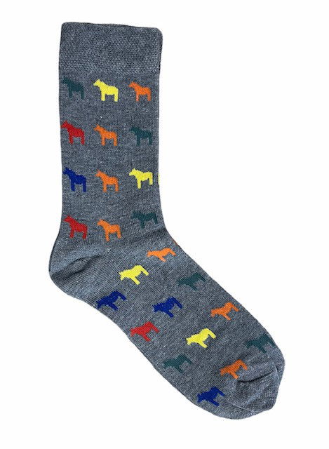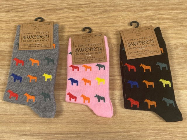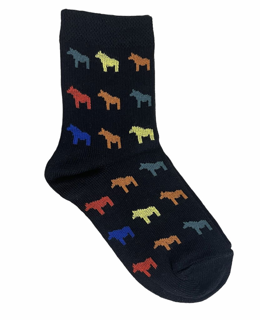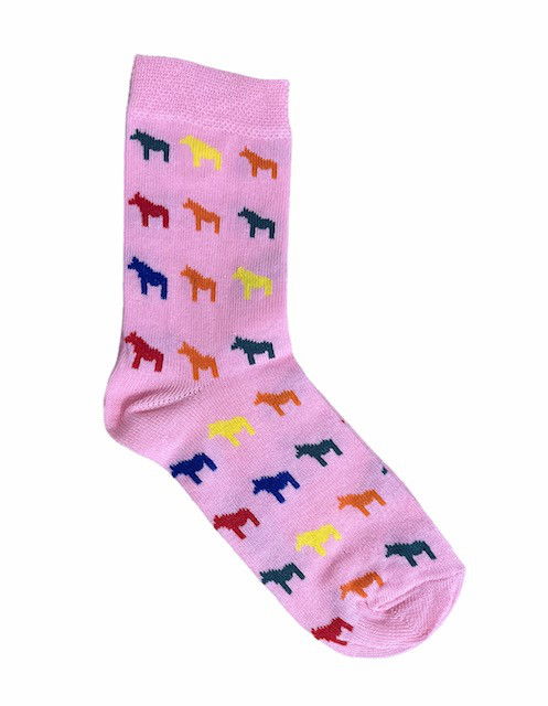 Strumpor för barn med motiv Dalahästar. Välj mellan tre olika färger och storlekar. Material: 80% bomull, 17% polyester, 3% elastan.