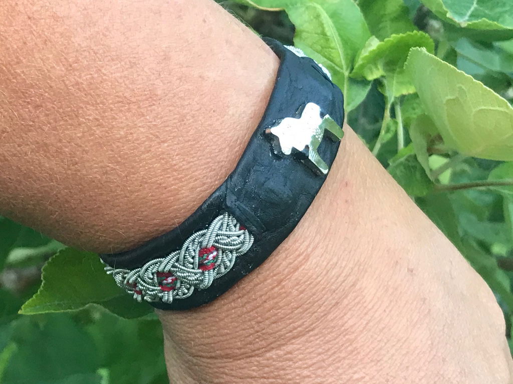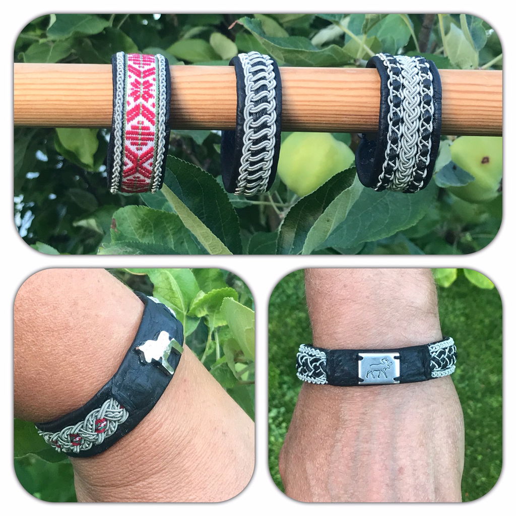Tennarmbanden är handsydda och kommer från sdesignmora. Armbanden är tillverkade i naturgarvat renskinn, spunnen tenntråd 4 % silver och renhornsknapp.