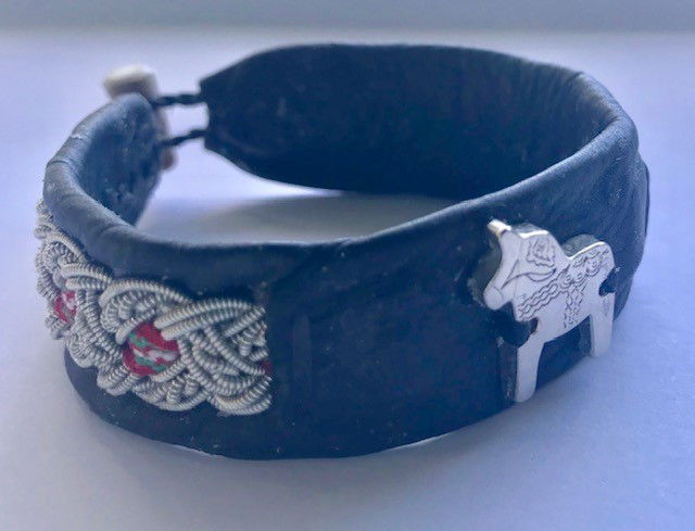 Tennarmbandet Eldris: Vackert handsytt tennarmband. Dalahäst i metall överdraget med silver och dalaband i tennflätan. Armbandet är ca 2,3 cm brett.