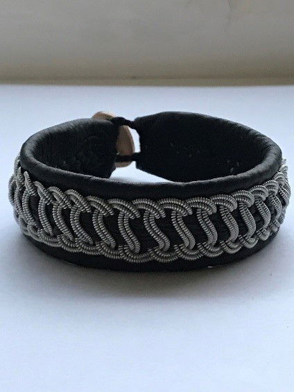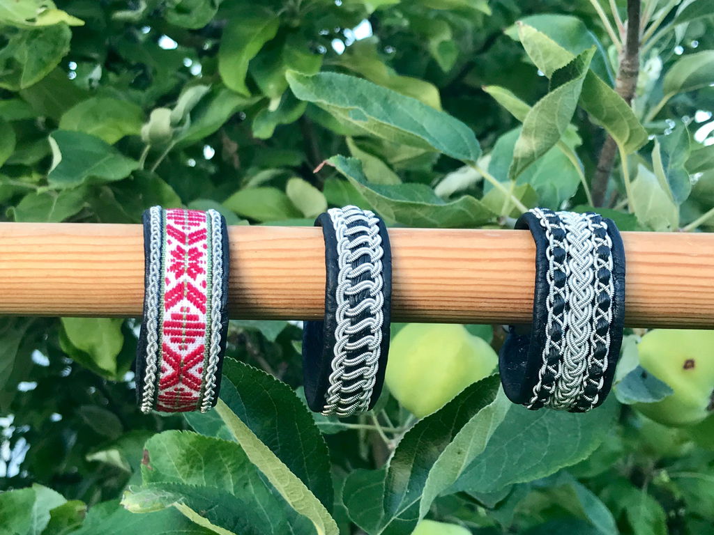 Tennarmbanden är handsydda och kommer från sdesignmora. Armbanden är tillverkade i naturgarvat renskinn, spunnen tenntråd 4 % silver och renhornsknapp.