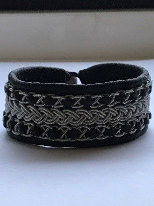 Tennarmbanden är handsydda och kommer från sdesignmora. Armbanden är tillverkade i naturgarvat renskinn, spunnen tenntråd 4% silver och renhornsknapp.