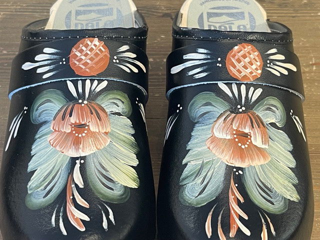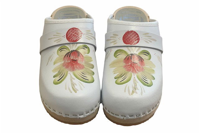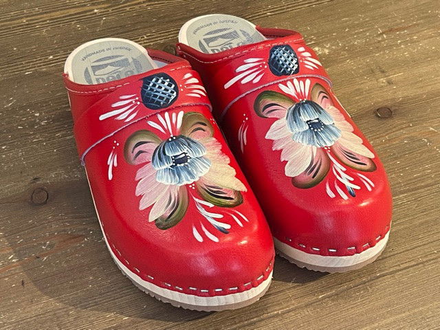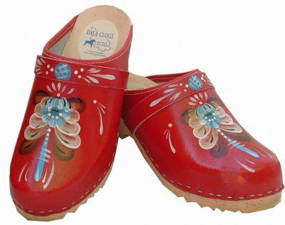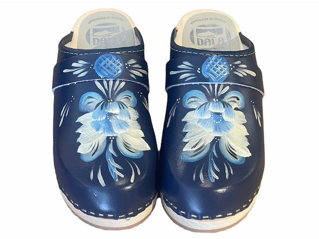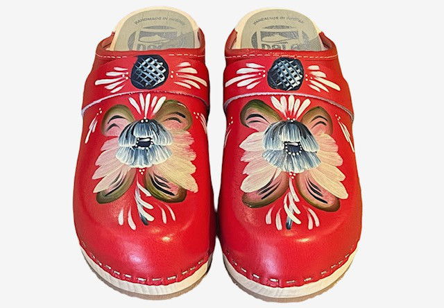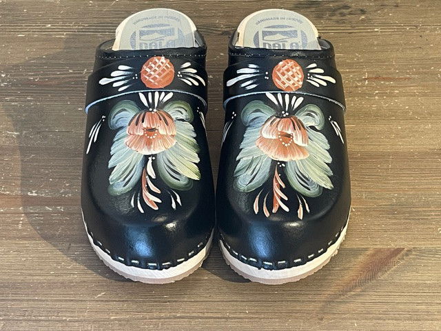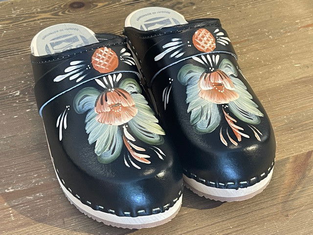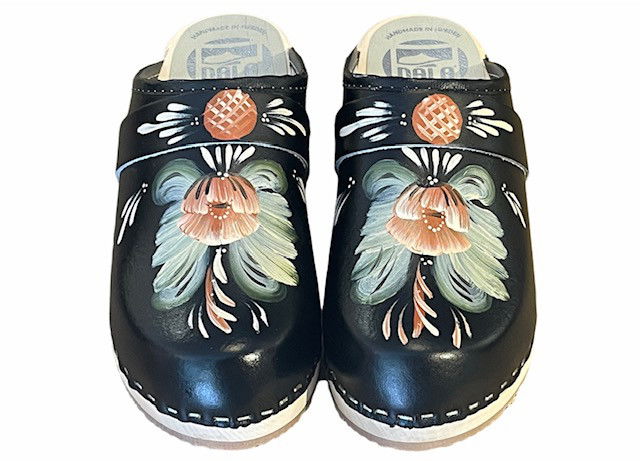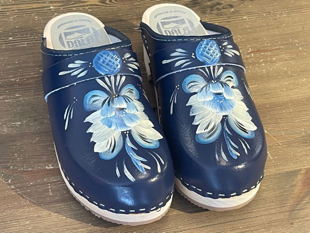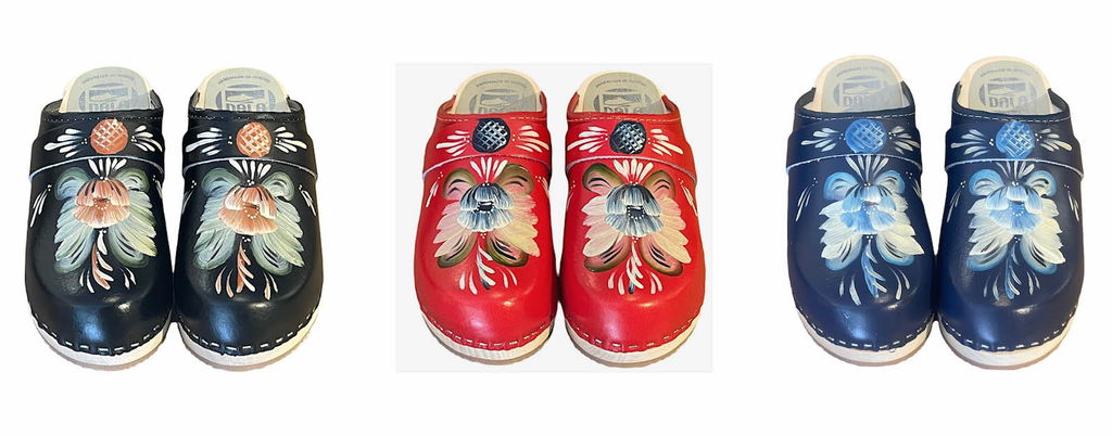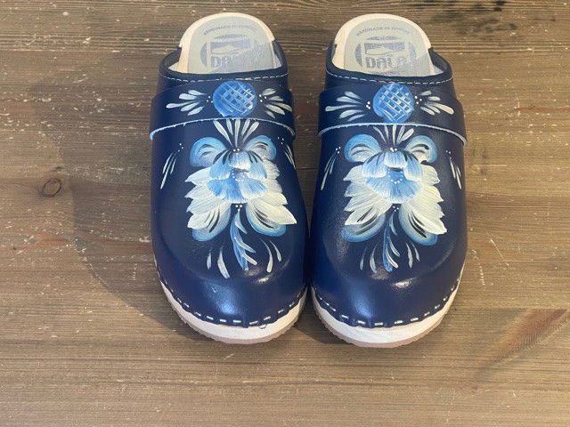 Träskor modell Dalarna med kurbitsmålning! Beställ gärna en storlek över din storlek då de kan uppfattas något små i storleken. Ett hantverk från Mora och byn Oxberg där dessa träskor tillverkas för hand i en småskalig produktion och sedan får sin kurbitsmålning. Du kan även välja till om du vill ha textning av exempelvis ditt namn för att göra dina träskor lite mer personliga. OBS: Bytesrätt gäller ej på textade träskor.